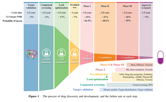 新药的研发是一个漫长,昂贵且充满风险的活动,一般来说可能需要十年以上的时间,10-20亿美元的投入,犹如千军万马过独木桥般充满着不确定性与艰辛,最终造就一个新药的诞生,如下图可见,尽管一个候选化合物进入临床试验仍旧有90%以上概率失败。从近几年接触国内的新药开发来看,即使是me too或者me better的药物,也感觉临床推进的越快,越是很早宣告失败。对于新药研发的进度,越早推进也能越早发现其中的风险,以避免进入临床研究后期发现具有极大缺陷,造成更大的损失。极早的宣告失败可能也不是坏事。