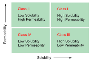 溶解度-渗透性关系对口服药物吸收的进一步应用是最初由Amidon等人开发的生物药剂学分类系统(BCS)。BCS的原理在其他地方有很好的描述药物分子的溶解度和渗透性能。根据BCS,I类分子是那些同时具有高溶解度和高渗透性的分子(因此口服吸收可能很少出现问题);II类化合物是那些具有低溶解度和高渗透性的化合物(其中溶解度是吸收的主要限制);III类化合物具有高溶解度但低渗透性(吸收受限于膜渗透而不是溶解度);IV类化合物是溶解性差和渗透性差限制药物吸收的化合物。(引用自参考文献3)