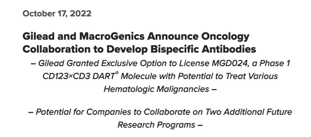 10月17日,吉利德和MacroGenics共同宣布将开展肿瘤学合作,吉利德获得CD123×CD3双抗药物MGD024的独家许可权,并可能在另外两个早期研究项目中进行合作。