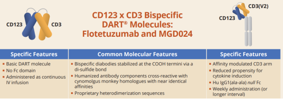 MGD024是通过MacroGenics的DART®平台开发的第二代CD123 x CD3 DART分子,在设计上延长了半衰期,减少了细胞因子的释放,因此适合间歇性给药。其主要适应症为急性髓系白血病(AML)。目前处于I期临床。