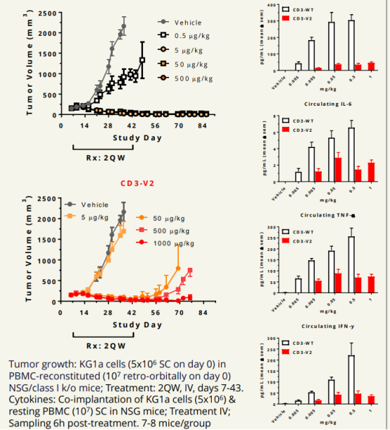 体内研究中,CD123 x CD3-V2 DART变体在人类PBMC重建的小鼠模型中表现出抗肿瘤活性。