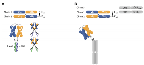 每条肽都包含一个VL结构域、短连接体、VH结构域、一个包括半胱氨酸的第二连接体和一个异源二聚结构域,半胱氨酸残基将两个肽链共价连接,形成链间二硫键,提高结构稳定性;