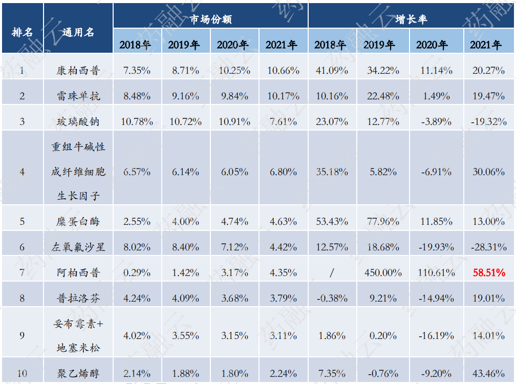 康柏西普在2021年位居第一,市场份额为10.66%;排名第二的是雷珠单抗,市场份额有10.17%。排名第三的玻璃酸钠市场份额有7.61%,近几年有所下滑。从 TOP10产品的销售增速看,阿柏西普在2021年增幅最大,其次是聚乙烯醇。