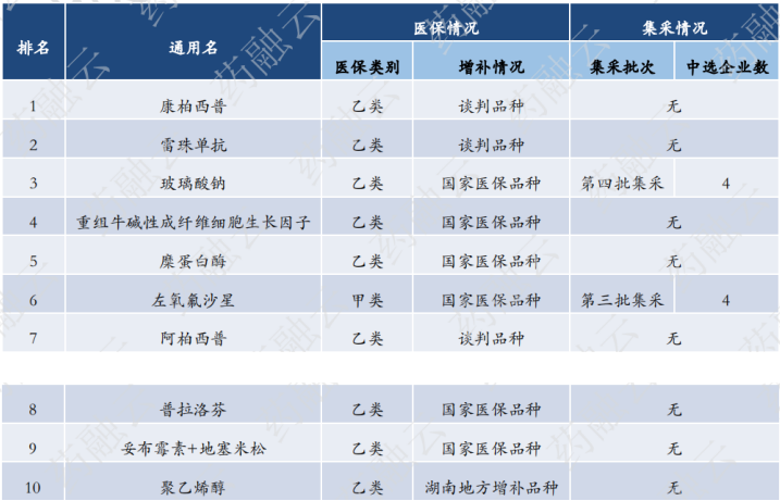 据药融云数据库显示:前十品种均为医保目录产品,除了聚乙烯醇为湖南地方增补品种外,其他产品均为国家医保品种。目前,只有玻璃酸钠(第四批集采)和左氧氟沙星(第三批集采)的眼用制剂已进入集采,其他8个品种均未入集采。
