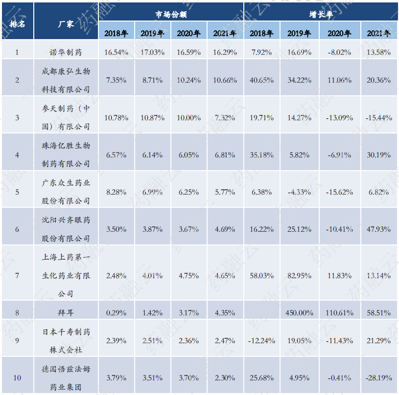 药融云全国医院终端(化学药加中成药)竞争格局数据显示:2021年眼科用药物TOP10 厂家合计占据
