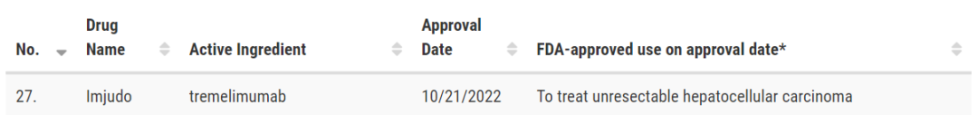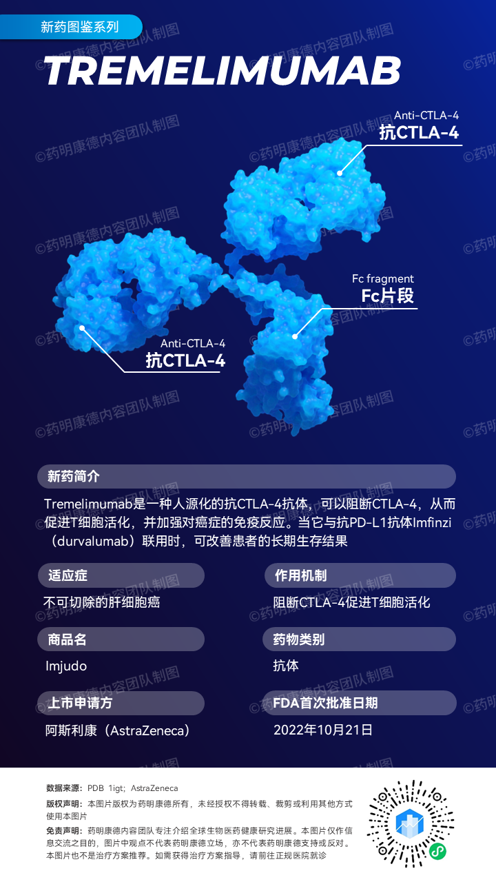 日前,美国FDA官网显示,阿斯利康(AstraZeneca)公司开发的抗CTLA-4抗体Imjudo(tremelimumab)已经获得批准,与抗PD-L1抗体Imfinzi(durvalumab)联用,治疗不可切除的肝细胞癌患者,为肝癌患者提供了一种由双重免疫检查点抑制剂构成的全新免疫组合疗法。
