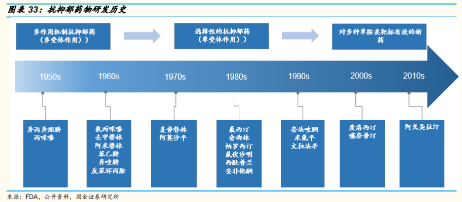 自1950年代单胺氧化酶抑制剂(MAOI)问世至今,抗抑郁药经历了多次产品迭代。