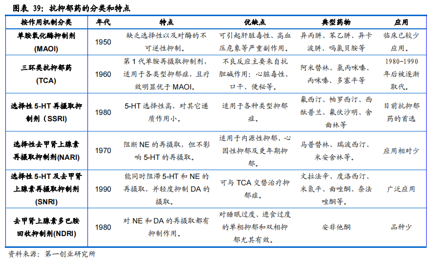 SSRI(5-HT再摄取抑制剂):出现于1980年代,代表品种为“五朵金花”:氟西汀(百忧解)、帕罗西汀(赛乐特)、舍曲林(左洛复)、氯伏沙明(兰释)、西酞普兰(喜普妙),以及后来由丹麦灵北制药研发的艾司西酞普兰(2002年获FDA批准),由于SSRI类药物不良反应较少且轻,还具有抗抑郁和抗焦虑双重作用,被广泛应用并成为首选药物;