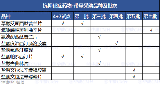 根据中康CMH统计显示,自2019年带量采购4+7试点开始,抗抑郁药已被纳入集采品种。截至第七批集采,共有9个抗抑郁药品种被纳入,27个本土企业中标,均为国产仿制药,打破了品类在医院市场被外资企业及价格较高的原研药主导的局面。