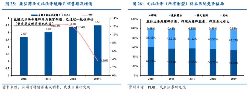 不过,凭借优异的疗效,文拉法辛在国内市场的销售一直保持稳健增长,根据PDB数据显示,文拉法辛(所有剂型)在样本医院的市场格局主要由辉瑞和凭借首仿身份、率先推出创新剂型-缓释片的康弘药业瓜分,2019年两者分别占据53.7%、42.57%的市场份额。