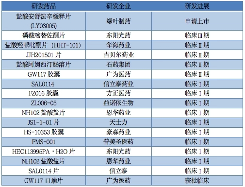 目前,绿叶制药、东阳光药、华海药业、石药集团、信立泰、天士力、恒瑞医药等十多家国内药企均有抗抑郁药在研发当中。