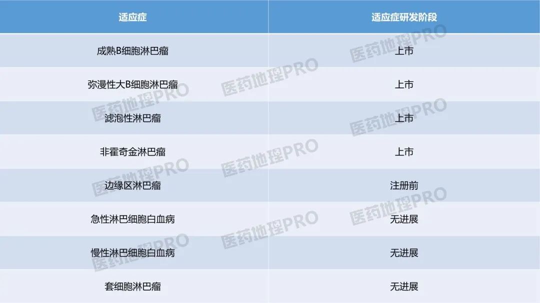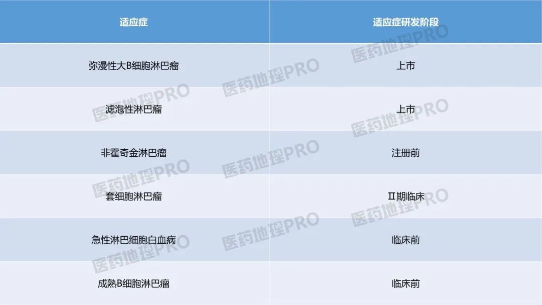 中国医药工业信息中心CPM新药研发监测数据库显示,阿基仑赛注射液正处于研发阶段的适应症共有8种,分别为成熟B细胞淋巴瘤、弥漫性大B细胞淋巴瘤、滤泡性淋巴瘤、非霍奇金淋巴瘤、边缘区淋巴瘤、急性淋巴细胞白血病、慢性淋巴细胞白血病及套细胞淋巴瘤。