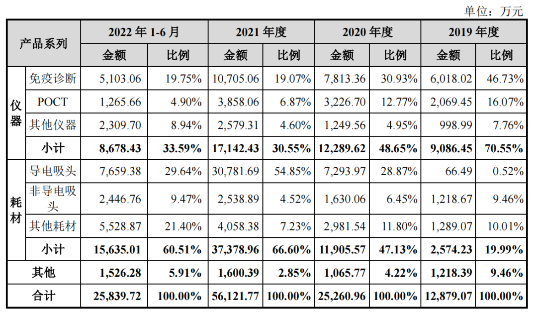 基于行业发展、新冠检测量大幅增加、公司累积仪器客户资源导入等因素影响下,公司耗材业务在2020年规模迅速扩大,与多家国际知名体外诊断试剂厂商及第三方实验室建立合作关系,从2019年的2574.23万提升至2021年的3.73亿。