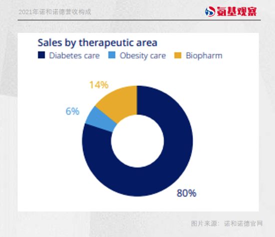 在过去近百年时间里,诺和诺德都在糖尿病领域不断深耕。根据公司2021年财报,其糖尿病业务营收达179.96亿美元,占总营收比重达80%。