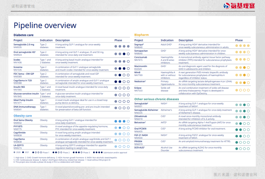 除了糖尿病外,诺和诺德管线仅集中于肥胖和罕见病两个领域。其中,肥胖也是糖尿病产品延伸的板块。