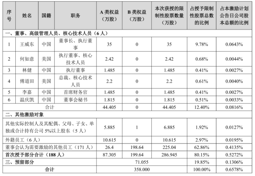 激励的对象包括在本公司任职的董事、高级管理人员、核心技术人员,其他实控人及其家属、外籍员工以及董事会认为需要激励的其他员工,合计188名员工(占2021年底员工总数的10.91%);