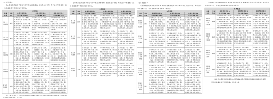 其中,首次授予方面:A类权益的考核年度为2022-2026年,B类权益的考核年度为2023-2026年,如果要达成业绩考核目标A(公司归属系100%),那么公司2022-2026年度的累计营业收入依次为7.5亿元、20亿元、40亿元、70亿元、110亿元(营业收入以合并报表所载数据为计算依据,不包括泰它西普的海外授权收益,下同),累计启动临床试验依次为6个、12个、20个、28个、36个。