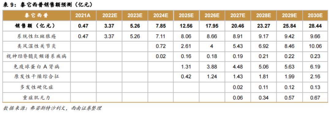 那么,根据弗若斯特沙利文&西南证券研报显示,综合各适应症获批年份、患者人数、年治疗费用等关键假设,预测泰它西普2022-2026年的销售额分别为2.37亿元、5.26亿元、7.85亿元、12.56亿元、17.95亿元。