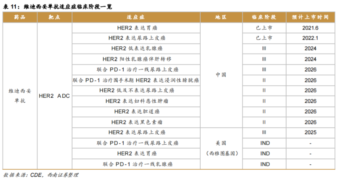 另外,目前荣昌生物正在开展维迪西妥单抗用于多种实体瘤的新适应症研发,其中在中国开展的HER2低表达乳腺癌、HER2阳性乳腺癌伴肝转移、联合PD-1治疗一线尿路上皮癌,以及在美国开展的HER2表达尿路上皮癌均处于临床Ⅲ期阶段,预计2024-2025年上市;在中国开展的联合PD-1治疗围手术期HER2表达浸润性膀胱癌、HER2低及不表达尿路上皮癌、HER2表达妇科恶性肿瘤、HER2表达胆道癌和HER2表达黑色素瘤均处于临床II期阶段,预计2025-2027年上市。