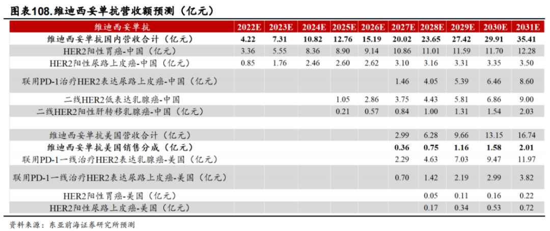 那么,根据东亚前海证券研究所研报显示,综合患者人数、各适应症获批年份、市场渗透率、年度治疗费用及海外市场销售分成与授权收入等关键假设,预测2022-2027年维迪西妥单抗的国内营收合计分别为4.22亿元、7.31亿元、10.82亿元、12.76亿元、15.2亿元、20.02亿元。