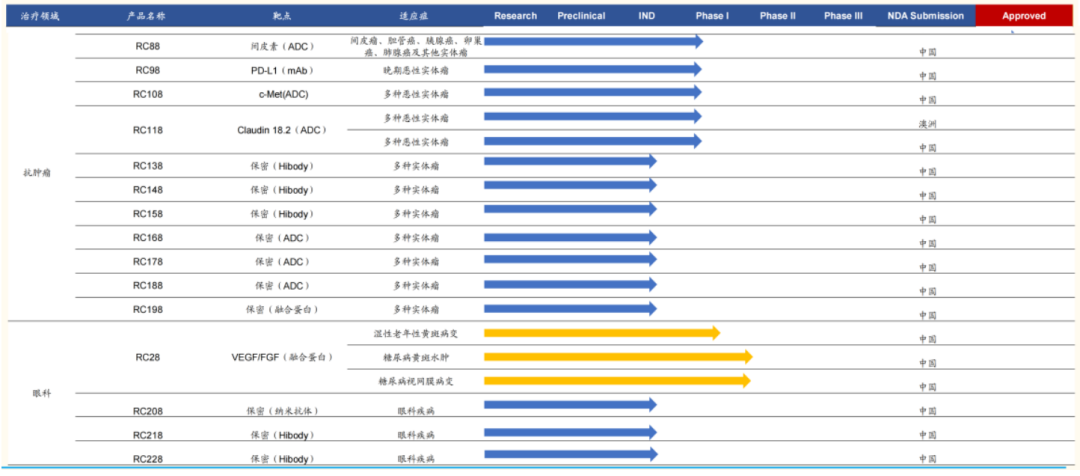 在抗肿瘤领域,除了维迪西妥单抗(RC48)以外,还布局了RC88、RC98、RC108、RC118等11款产品,药物类型覆盖PD-L1、ADC和融合蛋白等。但除了RC48以外,其余大部分处于Ⅰ期临床或临床前阶段。
