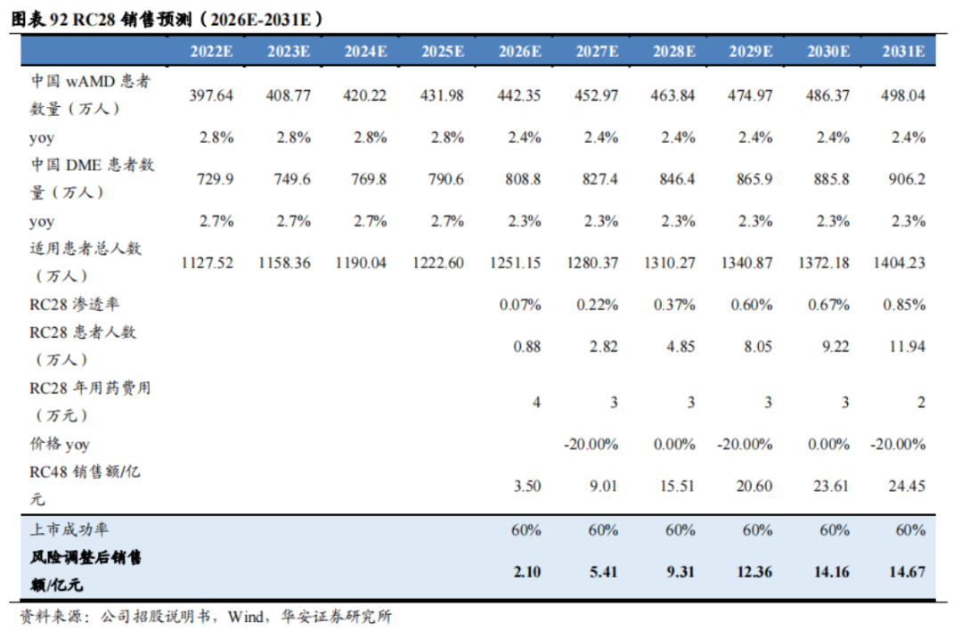 根据华安证券研报预测,假设RC28的AMD、DME这两个适应症能在2026年初上市,年治疗费用参考康柏西普的定价(纳入医保前4万元,之后每两年降价20%),那么2026年、2027年的国内销售额(风险调整后)合计为2.1亿元、5.41亿元。