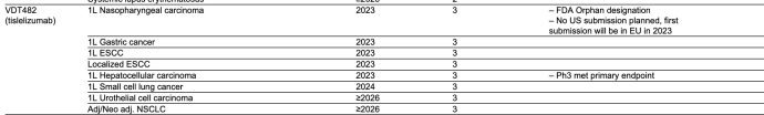 在美国,FDA延期了替雷利珠单抗针对既往全身治疗后不可切除的复发性局部晚期或转移性ESCC的BLA审批时间,但百济神州将继续支持诺华计划于2023年在美国递交的替雷利珠单抗用于一线治疗胃癌、一线和局部治疗ESCC和一线治疗肝细胞癌(HCC)的药政申报工作。
