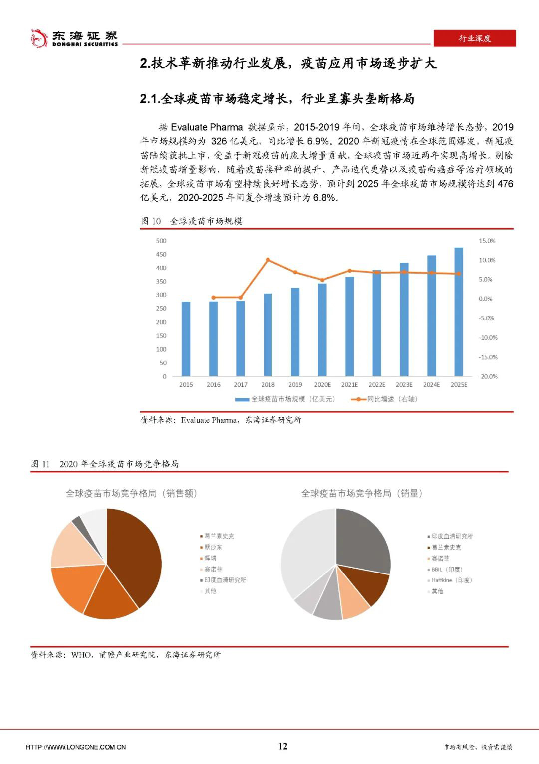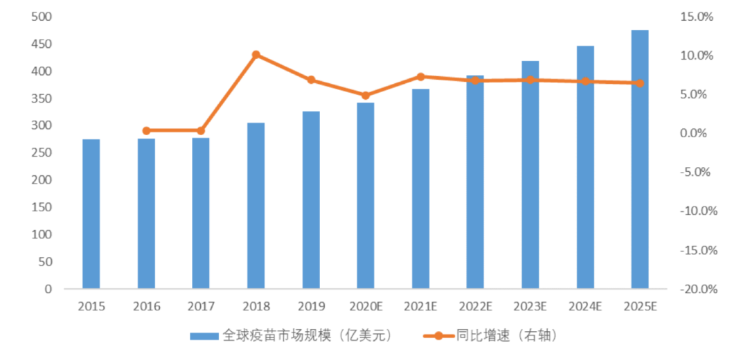 据EvaluatePharma数据显示,2019年全球疫苗市场规模为326亿美元,剔除新冠疫苗的增量影响,市场规模将于2025年达到476亿美元,2020-2025年间复合增速预计为6.8%。