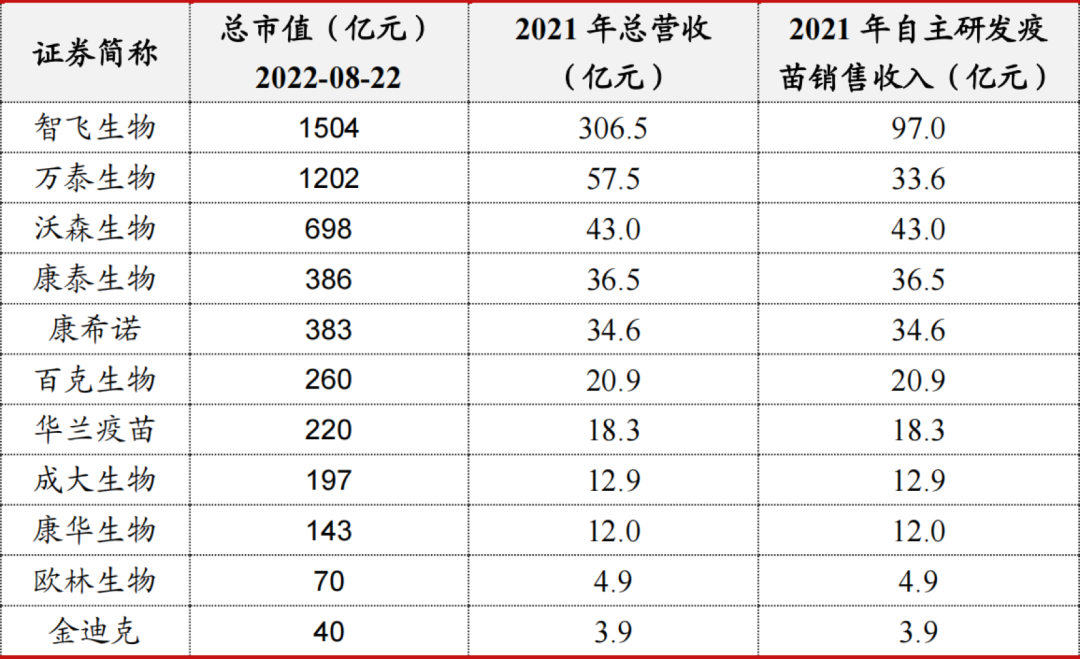 目前A股医药生物板块共有11家上市公司生产销售人用疫苗。从营收规模看,剔除其他业务和非自主生产疫苗产品之外,2021年自主研发疫苗产品营收规模最高的四家上市公司分别为智飞生物、康希诺、康泰生物和沃森生物。