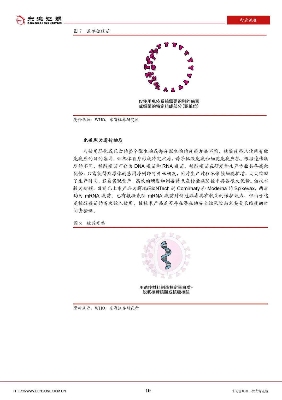 以mRNA技术为典型代表的新型疫苗技术近年来得到快速发展,未来有望逐步替代传统疫苗,成为主流技术。目前采用新型技术的疫苗产品较少,其安全性和免疫原性有待进一步观察和评估。随着研究的不断深入,新型疫苗在研发、生产、工艺等多方面也将不断改良与完善,从而带动整个疫苗产业的发展与更迭。