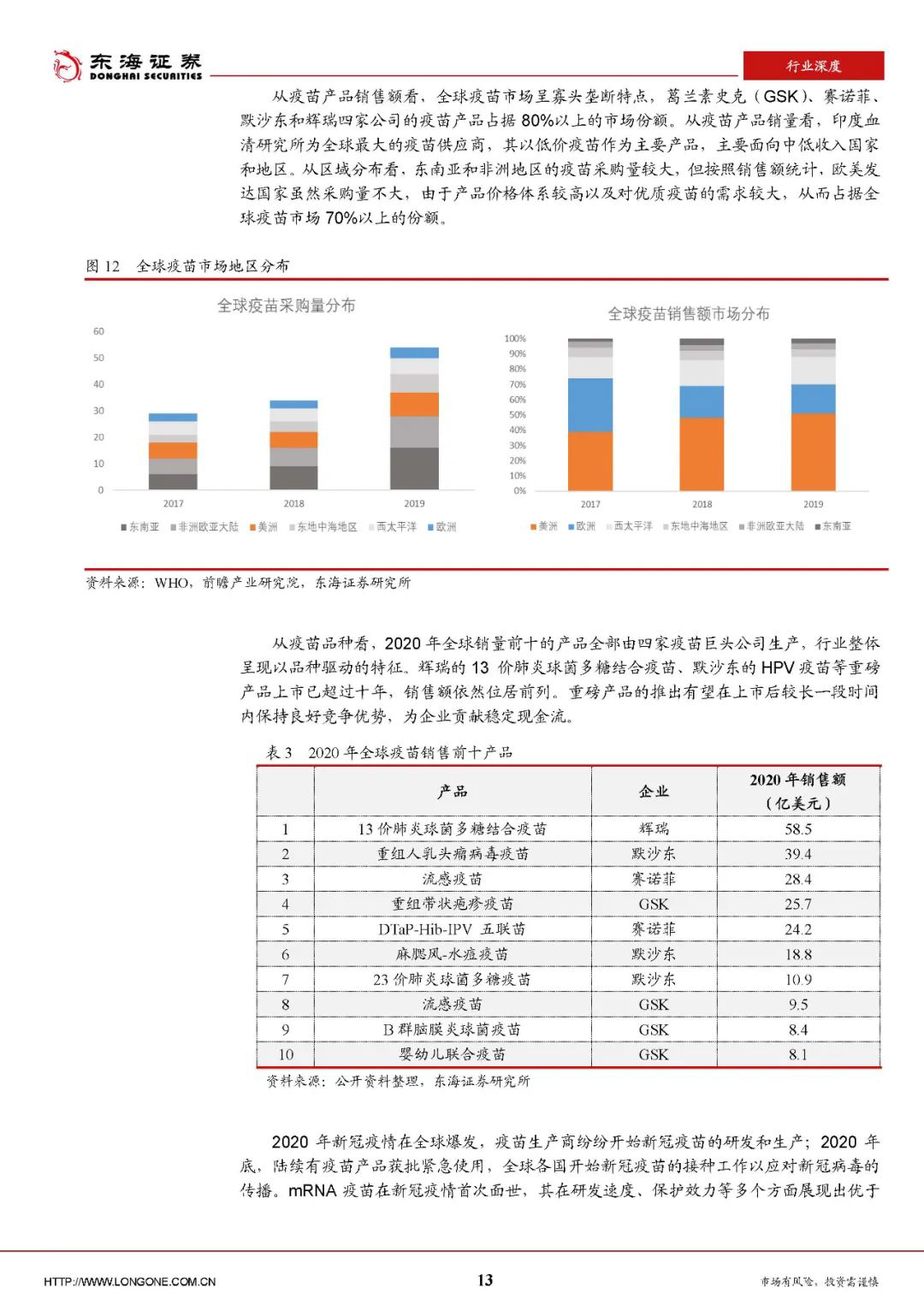 从疫苗品种看,2020年全球销量前十的产品全部由四家疫苗巨头公司生产,行业整体呈现以品种驱动的特征。辉瑞的13价肺炎球菌多糖结合疫苗、默沙东的HPV疫苗等重磅产品上市已超过十年,销售额依然位居前列。重磅产品的推出有望在上市后较长一段时间内保持良好竞争优势,为企业贡献稳定现金流。
