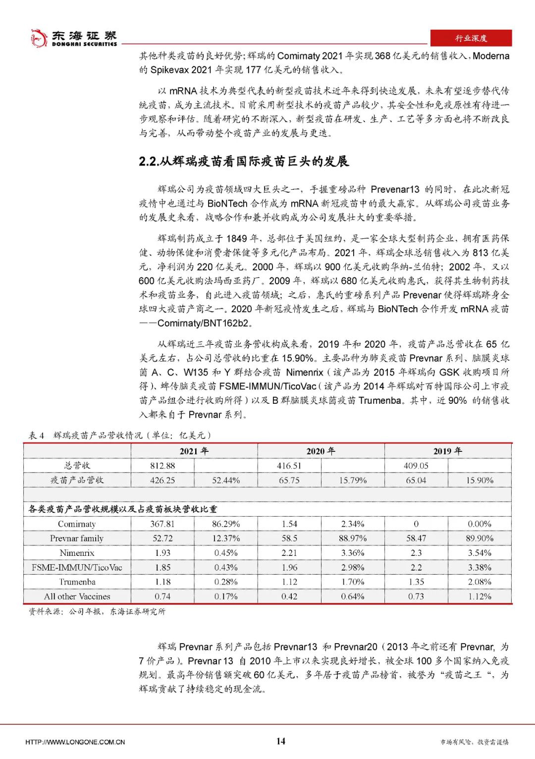 辉瑞制药成立于1849年,总部位于美国纽约,是一家全球大型制药企业,拥有医药保健、动物保健和消费者保健等多元化产品布局。2021年,辉瑞全球总销售收入为813亿美元,净利润为220亿美元。2000年,辉瑞以900亿美元收购华纳-兰伯特;2002年,又以600亿美元收购法玛西亚药厂。2009年,辉瑞以680亿美元收购惠氏,获得其生物制药技术和疫苗业务,自此进入疫苗领域;之后,惠氏的重磅系列产品Prevenar使得辉瑞跻身全球四大疫苗产商之一。2020年新冠疫情发生之后,辉瑞与BioNTech合作开发mRNA疫苗——Comirnaty/BNT162b2。