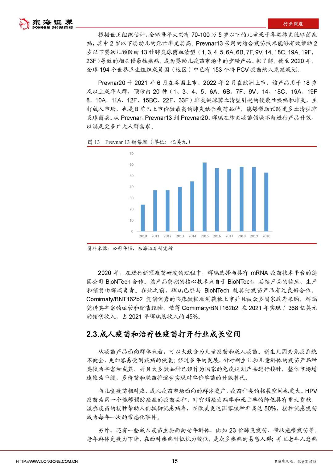 辉瑞Prevnar系列产品包括Prevnar13和Prevnar20(2013年之前还有Prevnar,为7价产品)。Prevnar13自2010年上市以来实现良好增长,被全球100多个国家纳入免疫规划。最高年份销售额突破60亿美元,多年居于疫苗产品榜首,被誉为“疫苗之王“,为辉瑞贡献了持续稳定的现金流。