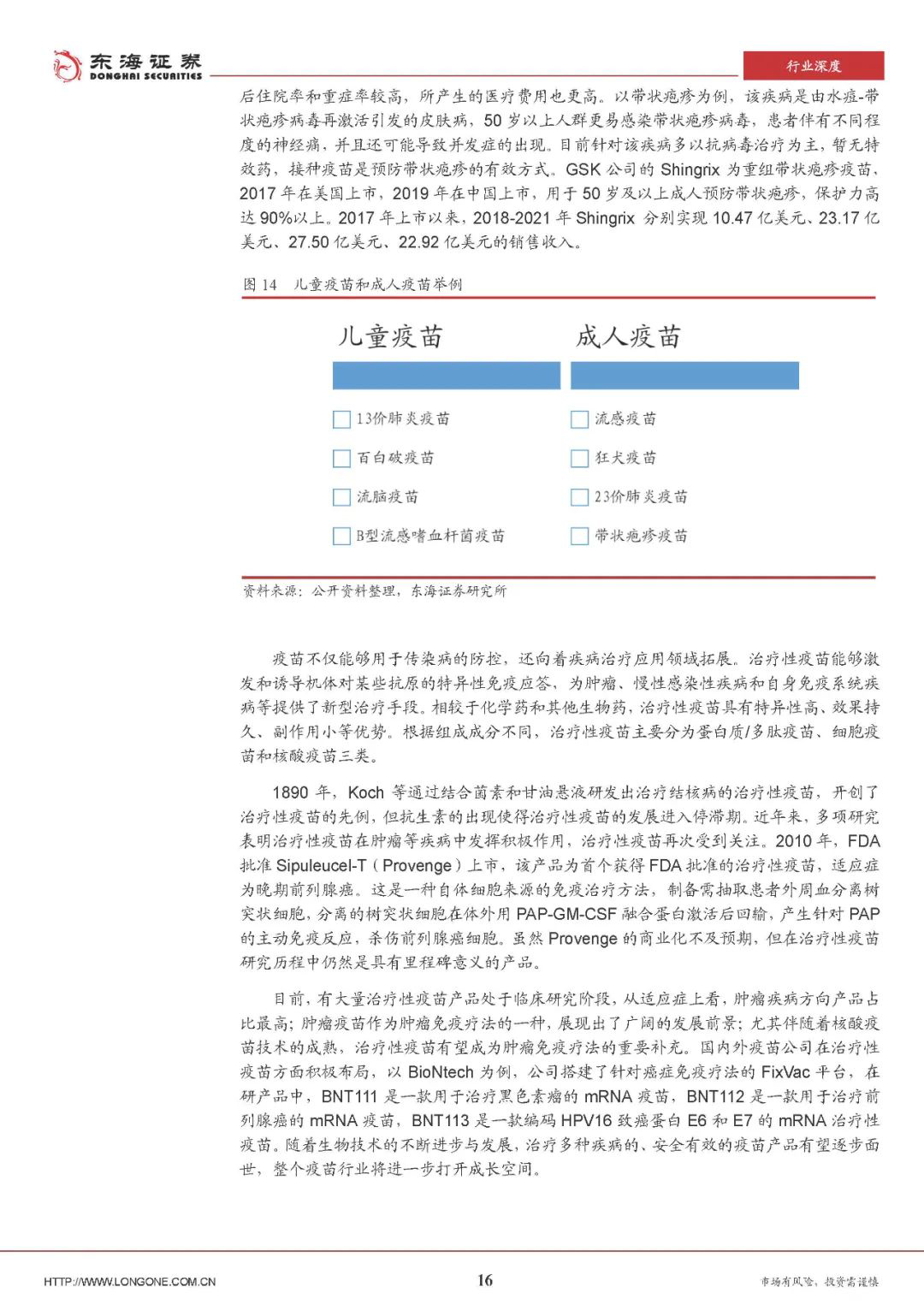2020年新冠疫情在全球爆发,mRNA疫苗首次问世,在研发效率、保护效力等多方面展现出显著优势,以mRNA技术为代表的新兴疫苗技术有望带动整个疫苗产业的升级更迭。除了疾病预防,疫苗产品也向着疾病治疗领域拓展,成人疫苗治疗性疫苗进一步打开了疫苗行业的成长空间。