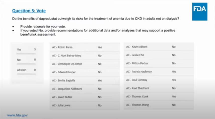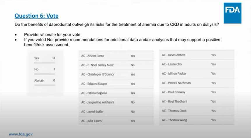 针对非透析依赖(NDD)患者,投票结果为11票否决,5票支持,专家们认为达普司他治疗风险太高,不仅会出现心力衰竭和胃糜烂出血(透析患者组也存在),还包括心脏病发作、中风,以及其他潜在并发症,治疗益处无法抵消其风险。
