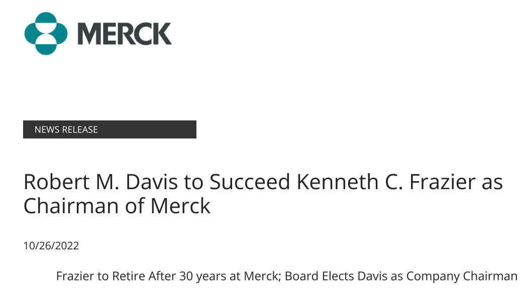 10月27日,默沙东宣布董事会一致选举Robert M.Davis担任董事会主席(董事长),自2022年12月1日起生效。他将接替Kenneth C.Frazier,后者计划于2022年11月30日退休,此前他在默沙东的长期职业生涯始于1992年。2011年至2021年,Frazier担任公司总裁兼首席执行官10年。2011年1月起担任默沙东董事,2011年12月起担任董事会主席。