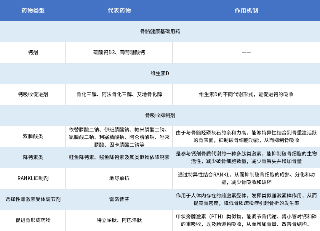 骨骼健康基础用药、骨吸收抑制剂、骨形成促进剂、钙吸收促进剂以及其他机制类药物。