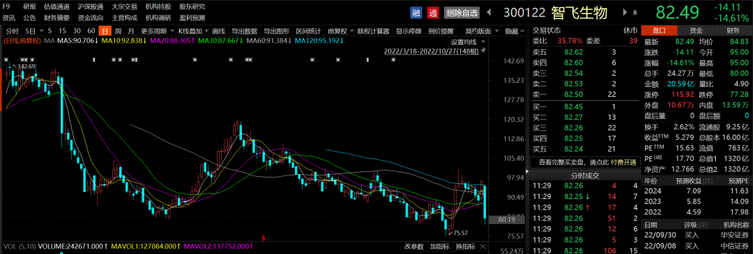 10月27日,疫苗巨头智飞生物开盘股价快速滑落,跌幅一度超过17%。截至午盘,智飞生物股价收报82.49元每股,下跌14.61%。