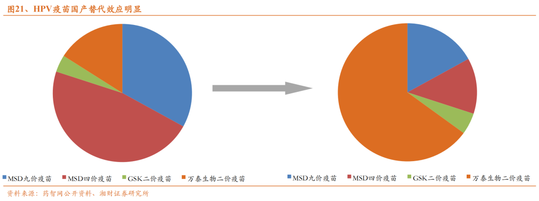 目前,国内获批的HPV疫苗分为2价、4价和9价,其中二价HPV疫苗国产品种有2家国内企业产品已获批,分别是万泰生物(2019年)和沃森生物(2022年),上市以来对进口疫苗的替代效应十分明显,从2020年16%的市场份额提升至2021年的65%。