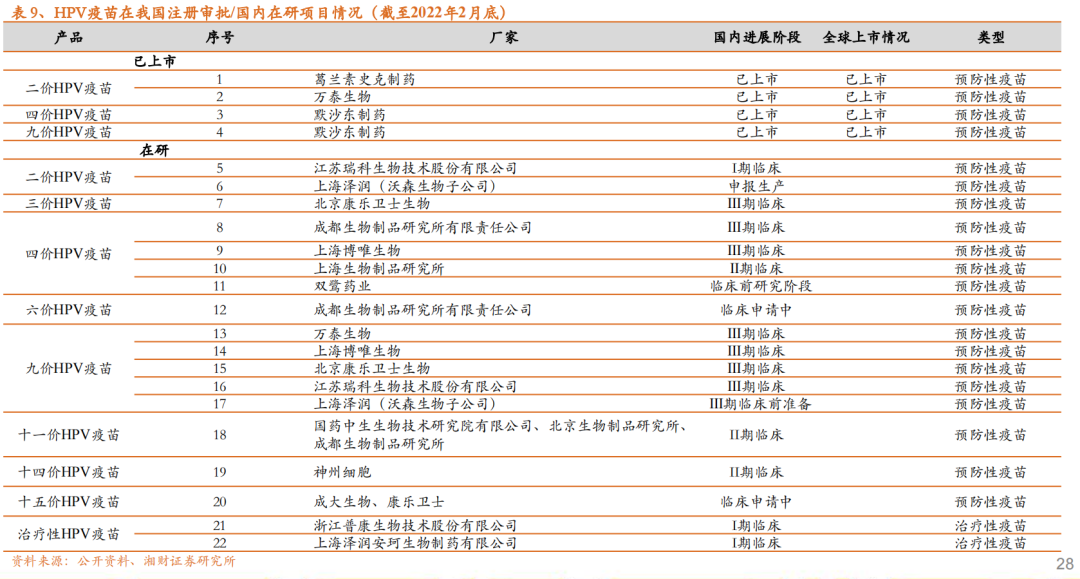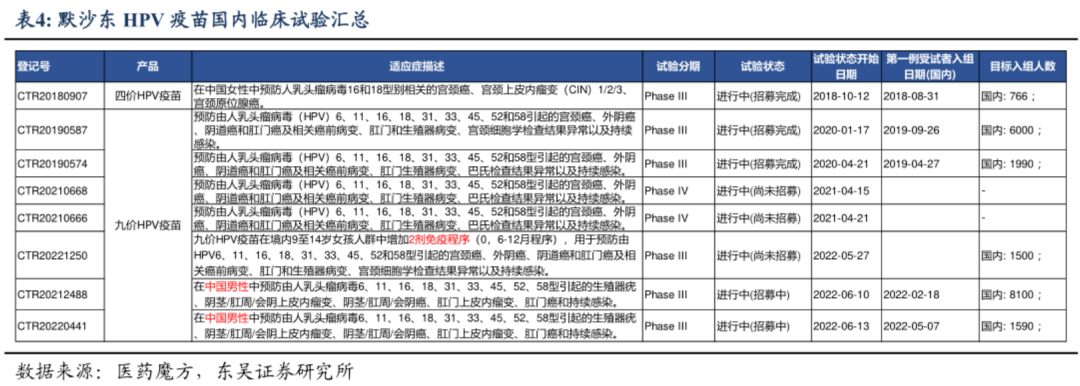 HPV大单品的巨大财富效应,激发了一批国产厂商的研发热潮,目前4价HPV疫苗在研处于临床三期的公司有成都生物所、上海博唯生物,9价HPV疫苗处于临床三期的公司有万泰生物、博唯生物、康乐卫士、瑞科生物和沃森生物(泽润生物)。