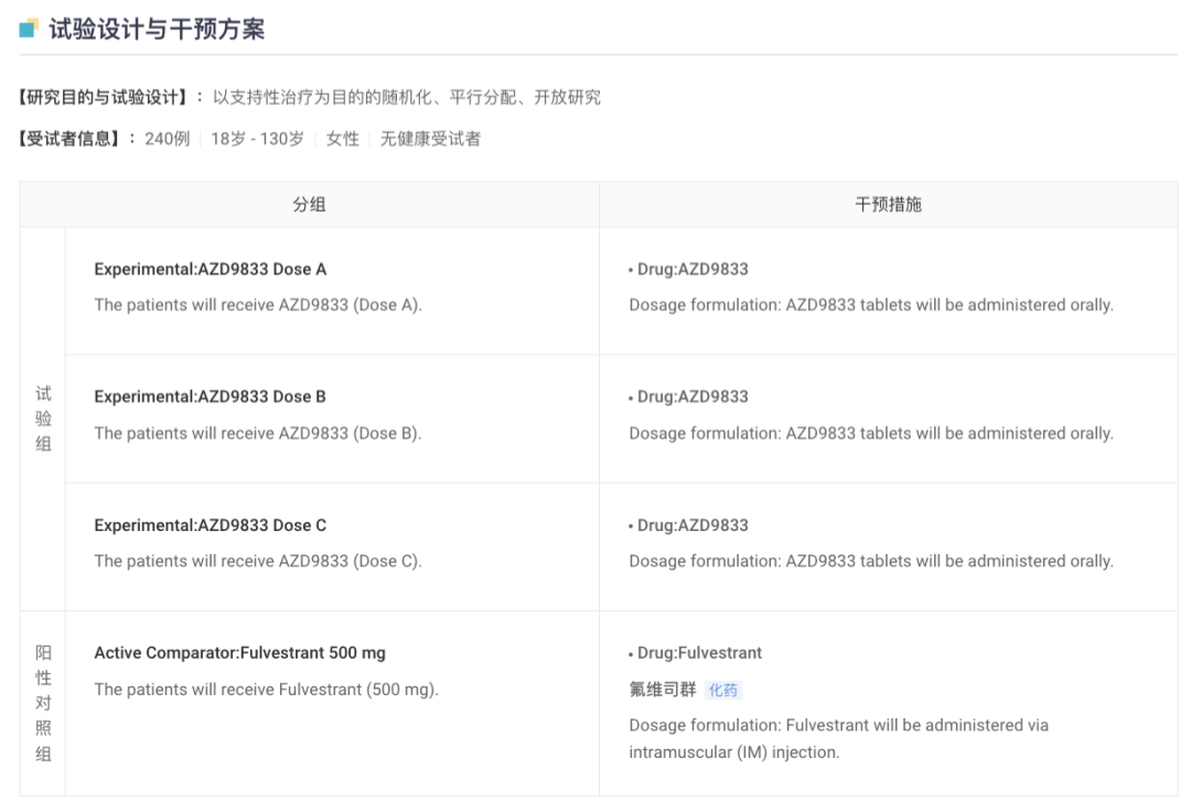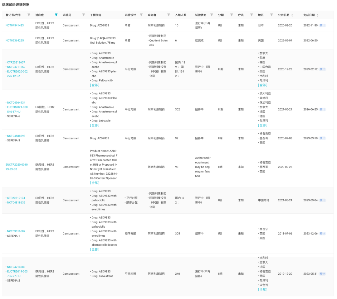 目前,Camizestrant 在乳腺癌领域已启动 9 项临床试验,除 ER+/ HER2- 乳腺癌患者外,Camizestrant 还在开展用于治疗 HR+、HER2- 患者的 III 期临床 SERENA-6 研究(登记号:NCT04964934),该研究于去年 6 月 启动,计划入组 302 例受试者,目前正在招募中,试验预计于 2026 年 6 月完成。