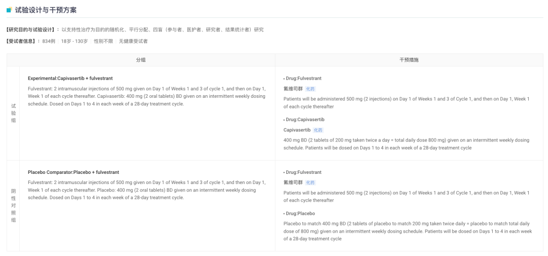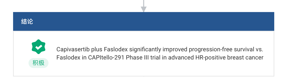 CAPItello-291 研究(登记号:NCT04305496)是一项随机、双盲 III 期临床试验,旨在评价 capivasertib 联合氟维司群与安慰剂联合氟维司群对比,在 HR 阳性/HER2 低或阴性肿瘤的局部晚期或转移性乳腺癌患者(曾接受过内分泌疗法后又发生进展或复发)中的疗效与安全性。