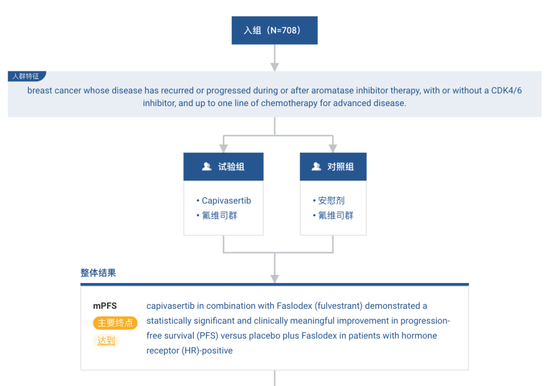 结果显示,研究达到双项主要终点:与安慰剂联合氟维司群相比,接受 capivasertib 联合氟维司群的患者,无论是总体病患群体还是预定的病患亚群中,其无进展生存期(PFS)均有统计学意义和临床意义的改善。此外,capivasertib 联合氟维司群的安全性与此前评估该组合试验中观察到的相似。具体试验数据同样将在未来的医学会议上公布。