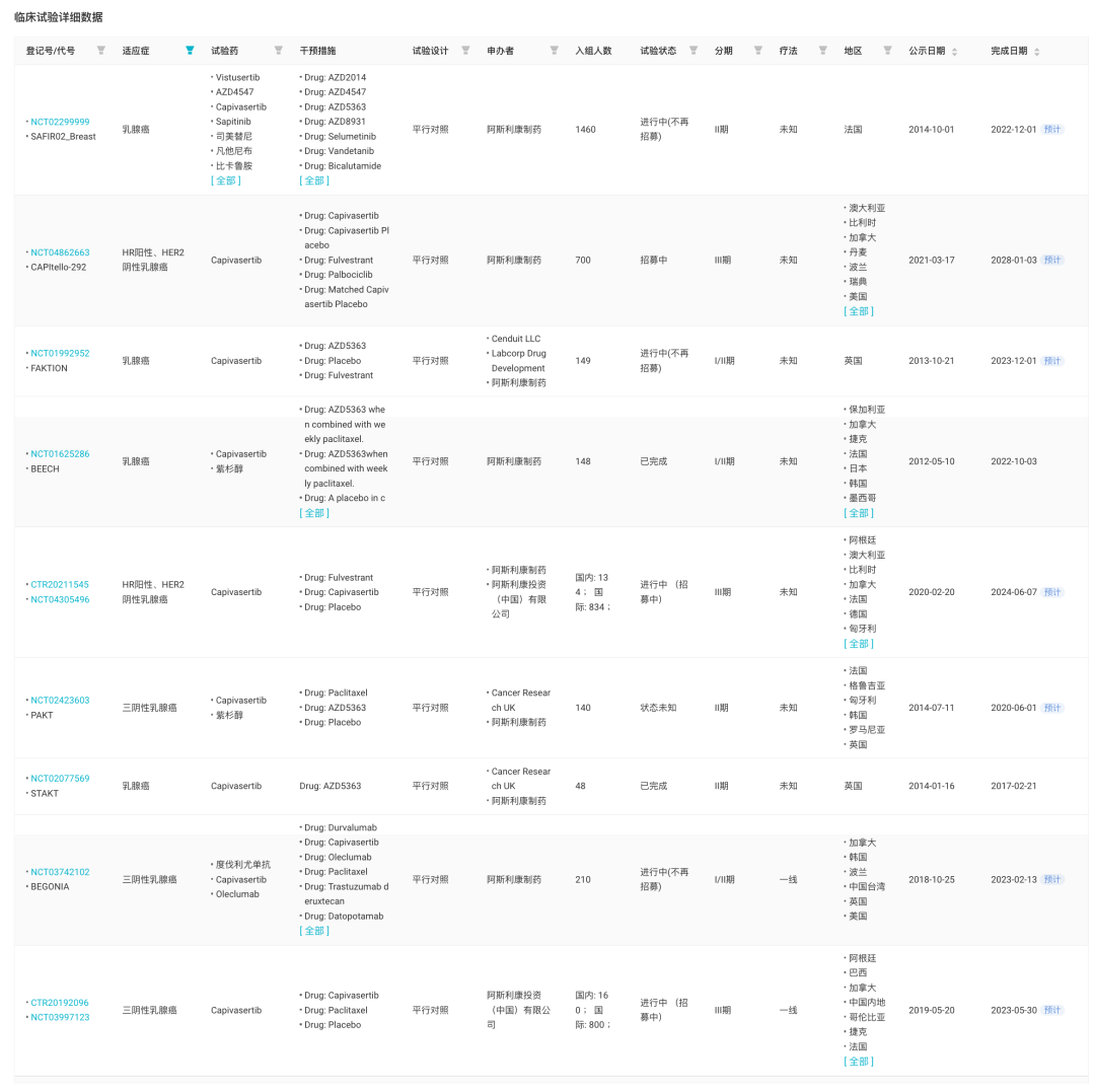 据 Insight 数据库显示,在乳腺癌领域,Capivasertib 已开展 9 项临床研究,其中,其联合化疗用于一线治疗三阴乳腺癌的研究也已进入 III 期临床阶段(登记号:CTR20192096、NCT03997123),并于去年 8 月完成首例受试者的入组工作。