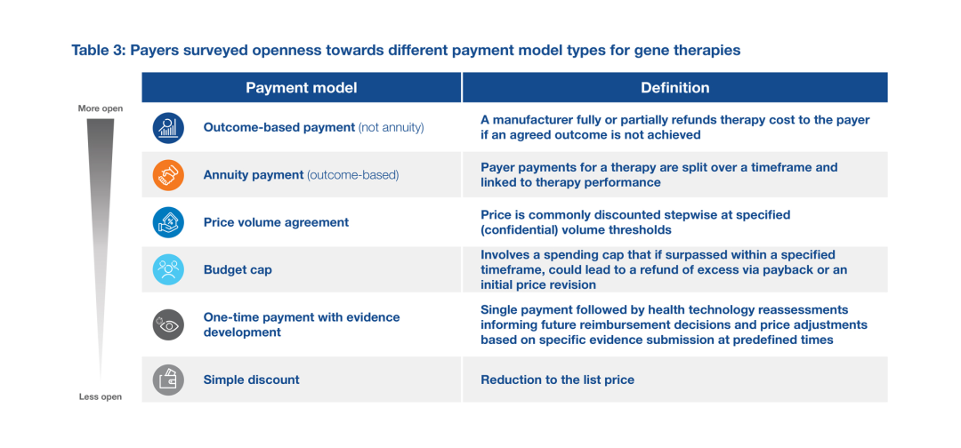 随着更多基因疗法的涌入,与下表中列出的其他模式相比,Research Partnership调查的支付方对以下模式更加开放,包括基于结果的支付(非年金)、年金支付(基于结果)和价格数量协议。