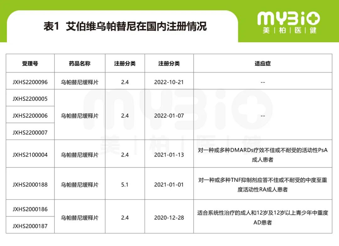 在国内,乌帕替尼(商品名:瑞福)最早于2022年2月被NMPA批准用于对其他系统治疗(如激素或生物制剂)应答不佳或不适宜上述治疗的成人和12岁及以上青少年的难治性、中重度AD患者,随后于3月被NMPA批准用于对一种或多种TNF抑制剂应答不佳或不耐受的中度至重度活动性RA成人患者,4月被NMPA批准用于对一种或多种DMARDs疗效不佳或不耐受的活动性PsA成人患者。