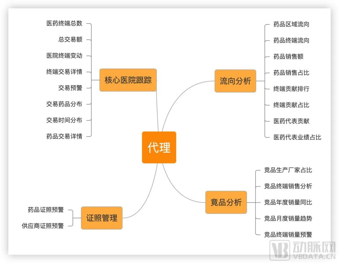 简单捋一下,仅从医药代理的维度,就能得到流向分析、竞品分析、核心医院追踪、证照管理等大类别的数据。