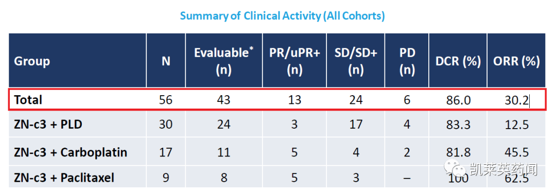 关于ZN-c3ZN-c3是一款潜在“first-in-class”的口服Wee1抑制剂,旨在诱导癌细胞中的合成致死,目前正在开发用于晚期实体瘤。此前,FDA已授予口服ZN-c3快速通道资格,用于治疗复发或持久性子宫浆液性癌。2022年4月,Zentalis在AACR大会上公布了ZN-c3与化疗联用,治疗对含铂化疗耐药,或难治性卵巢癌患者的1b期临床试验数据,结果显示:在43名可以评估疗效的患者中,组合疗法达到30.2%的客观缓解率(ORR)和86.0%的疾病控制率(DCR)。