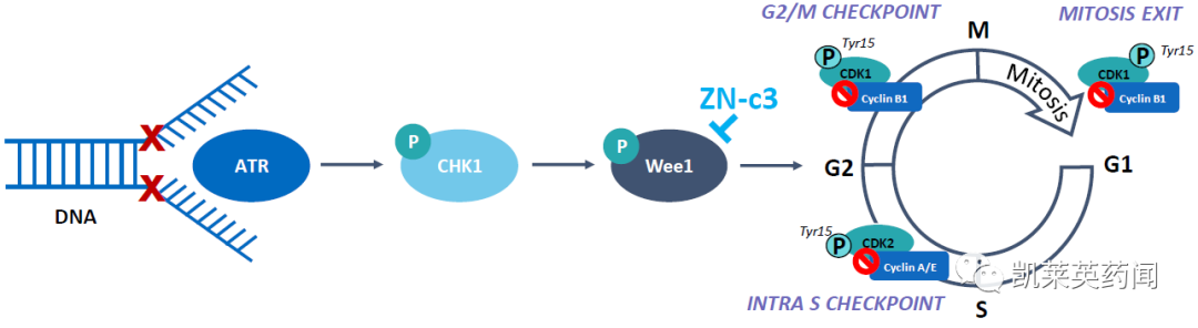Wee1激酶是G2/M检查点的关键调节因子,通过磷酸化CDK1 Tyr15实现G2/M阻滞,为DNA修复留出时间。抑制Wee1可消除细胞周期阻滞, 促使细胞提前进入M期,导致复制应激和有丝分裂灾难,引发肿瘤细胞调亡。