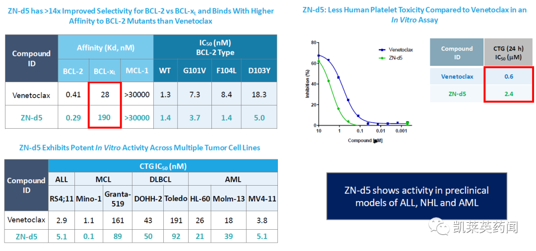 ZN-d5 是B 细胞淋巴瘤 2 (BCL-2) 的口服选择性抑制剂,最初开发用于治疗血液系统恶性肿瘤和相关疾病。BCL-2和BCL-xL 是在细胞死亡调节中起关键作用的蛋白质,在许多癌症类型中经常检测到BCL-2 和/或 BCL-xL 的过表达,从而阻止癌细胞的凋亡。BCL-2抑制剂将细胞凋亡过程恢复正常,成为癌症治疗的重要靶点。目前,公司正在开展ZN-d5在 AML 和非霍奇金淋巴瘤 (NHL) 患者的 1 期试验,以及在复发或难治性轻链(AL) 淀粉样变性患者的1/2 试验,未来的临床开发还将包括组合疗法。